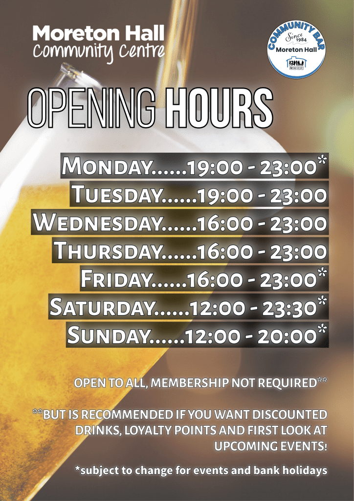 We have various rooms available to hire for businesses, local clubs and groups plus a large hall for hire with bar facilities – you can check availability and send an enquiry from our Live Bookings Calendar. We are also home to a Social Club & Community Bar with a thriving membership – families are very welcome! Several darts teams are based here, weekly Poker and a Pool team. Bingo evenings run every other week, details of upcoming events can be found here, on our socials (search @moretonhallclub) and details are also emailed to our members.